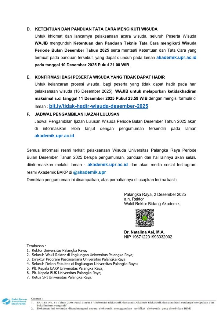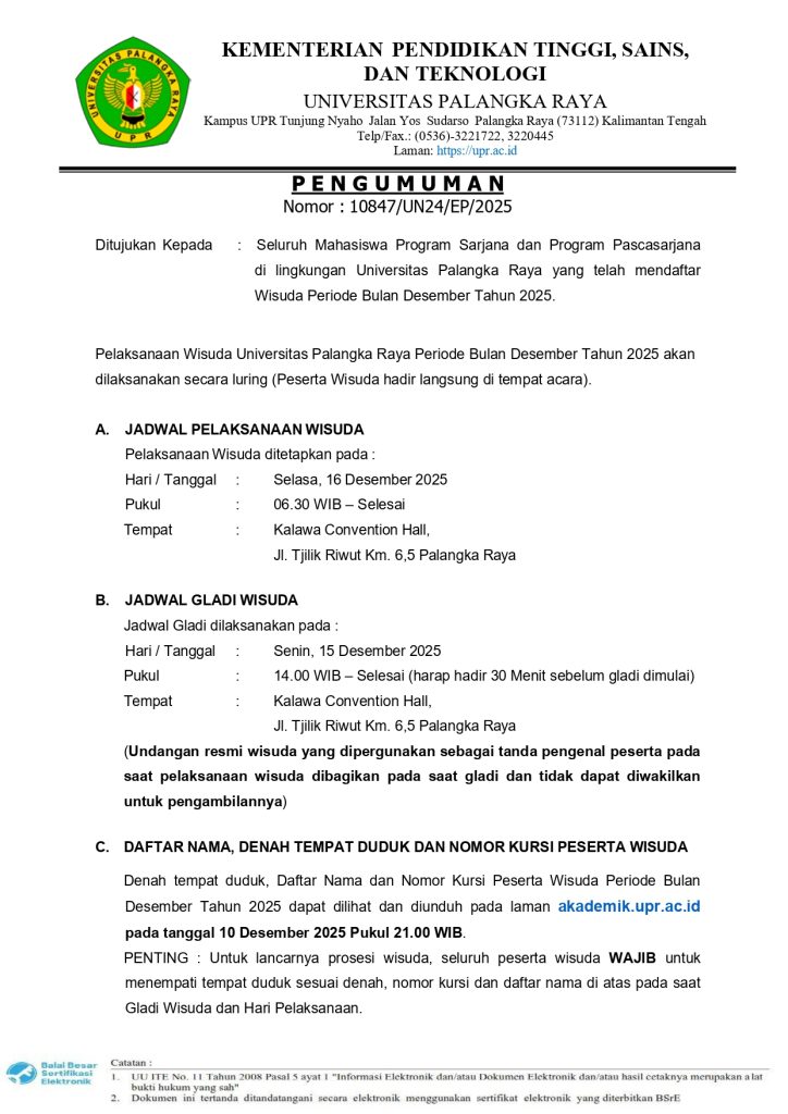 PENGUMUMAN : JADWAL GLADI WISUDA DAN TANGGAL PELAKSANAAN WISUDA UPR PERIODE BULAN DESEMBER TAHUN 2025