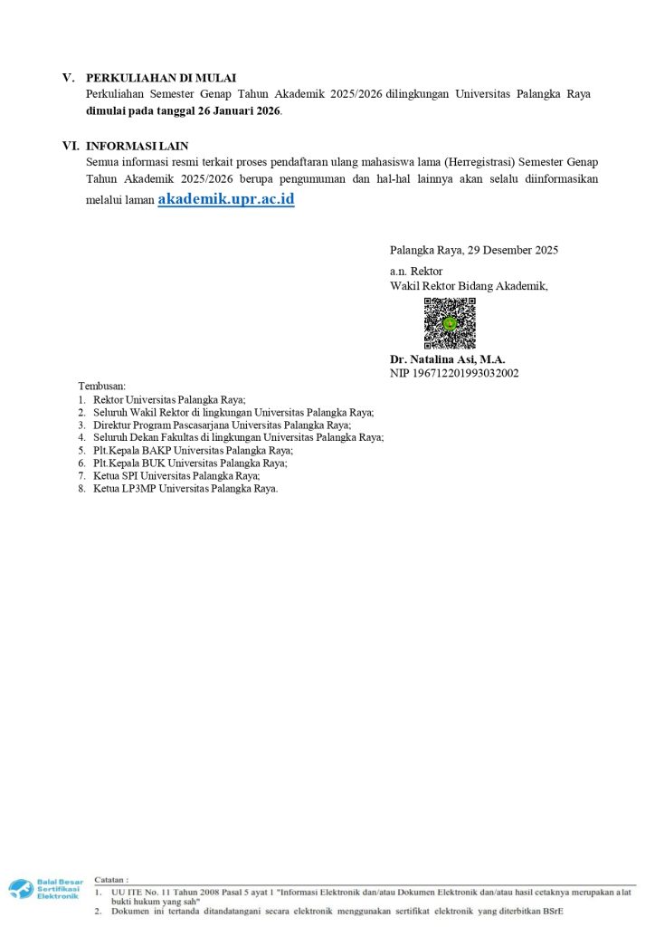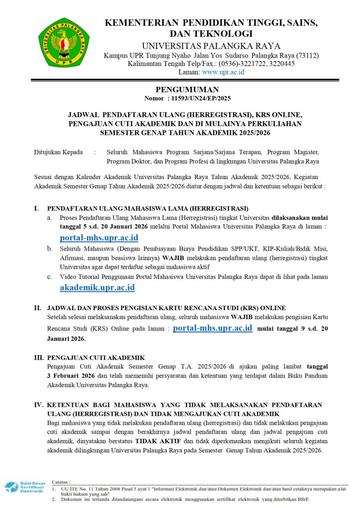 PENGUMUMAN : JADWAL PENDAFTARAN ULANG (HER-REGISTRASI), KRS ONLINE, PENGAJUAN CUTI AKADEMIK DAN DI MULAINYA PERKULIAHAN SEMESTER GENAP T.A 2025/2026