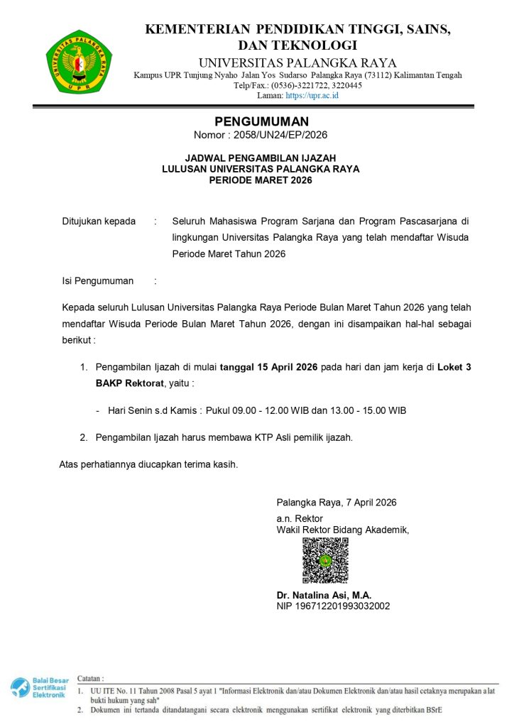 PENGUMUMAN: JADWAL PENGAMBILAN IJAZAH LULUSAN UNIVERSITAS PALANGKA RAYA PERIODE MARET 2026