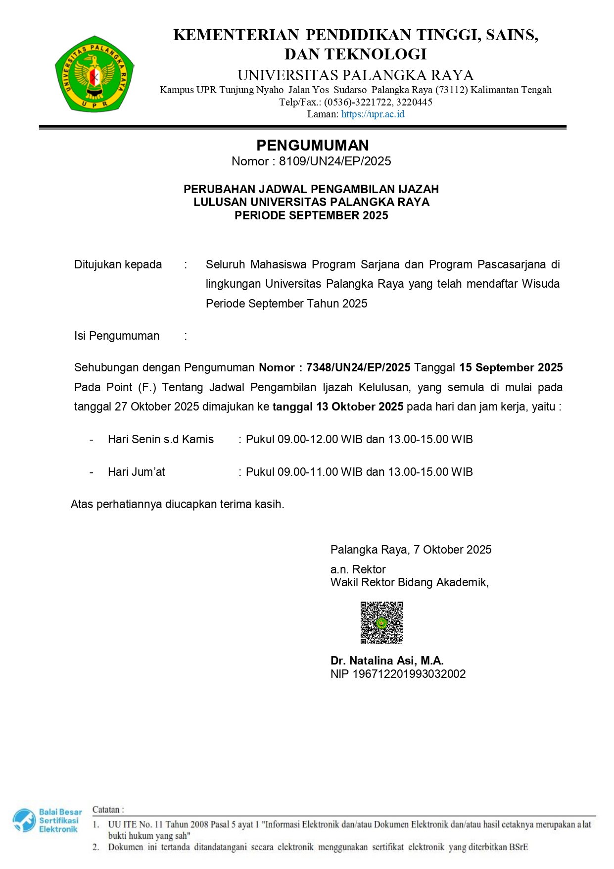 PENGUMUMAN: PERUBAHAN JADWAL PENGAMBILAN IJAZAH KELULUSAN UNIVERSITAS PALANGKA RAYA PERIODE BULAN SEPTEMBER 2025